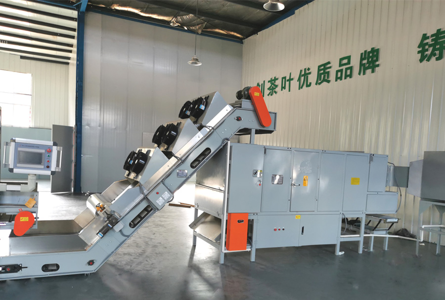 作業(yè)原理:機(jī)組采用搭接式結(jié)構(gòu),上料裝置與烘干箱體獨(dú)立,在防止漏茶的同時也減輕烘干機(jī)負(fù)載;采用臺灣輕型鏈條及雙滾輪、雙卷邊翻板,減少漏茶、夾茶 且降低運(yùn)行噪音;等寬輸送使上料厚度更均勻;烘干箱體采用矩形管設(shè)計及石棉保溫處理,保證了烘箱四周的烘干溫度。